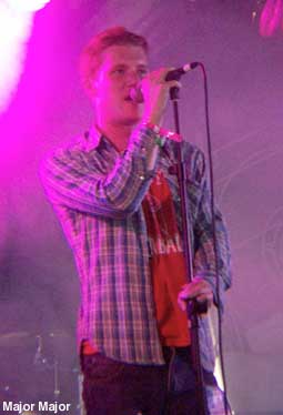 Also in the wee tent, Major Major, and for all the improvements in the Tbreak tent, it seems that the sound system is maybe still lacking a bit. Certainly for bands who plan a mix of distortion and tunes the tunes seem to rather get lost. And tunes is what Major Major do best - as has been mentioned before there's a healthy dollop of Sonic Youth gone into the primordial soup from whence they came, but equally some of the pop nous of Idlewild (their singer even appears to have subconsciously picked up Roddy Woomble's singing stance). Eventually, hearing acclimatised, their catchy pop emerges from the din. |