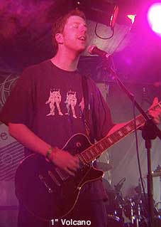 Nerve are, like Degrassi, one of the bands who've received a bye to the Treak stage , presumably on account of their having records and a ready-made audience. It comes as strange, as there are loads of bands in Scotland doing the same retro-punk thing - Stiff Little Fingers with a touch of emo and the Buzzcocks - but to less acclaim, for example T-break non-qualifiers Barefoot. As is often the case the audience love 'em, but your reviewer doesn't. Not that Nerve they're bad, just nothing different for me, their blend of punk rock and garagey thrash being a bit, well, ordinary. And not as shouty as I'd been led to believe. One Inch Volcano similarly aspire to noisy pop with a bit of an 'angular' (that's loud/quiet/start/stop for our older readers) slant. Driven by some fine guitar riffs their mix of noise and tunes is about right, though potential high-point 'Ants' was rather spoiled by the decision to hand the mike to the audience. And that was that. ok, Oasis and Basement Jaxx played, but the last thing we saw was a giant Bobby Gillespie, looking like a body double for Hopkirk (Desceased), doing 'Get Your Rocks Off to a throng on the hill. However, a more promising day lay ahead and we retired to our salubrious travel lodge to prepare. |