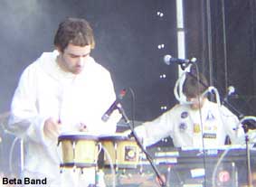 So, another peak in an unexpectedly good day for music, and more to come. However, the only problem with the Beta Band, Sonic Youth and Green Day coming up is how to arrange your time. Well, the Beta Band kick things off, and, resplendent in white space suits (possibly) they rather join in with the spirit of the day by doing 'Broke' in a distorted spiky guitar-driven style. Maybe it's the iffy NME-Stage sound again, but they're not grabbing me so I venture to catch Sonic Youth. (I'm later told that the Beta Band improved immeasurably after I left with 4 drummers, great material, and an apparently fabulous stage show involving time travel and the crucifixion of Margaret Thatcher). |