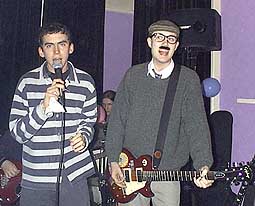 | The Pendulums, as is the pattern here, are doing their first gig after 2 rehearsals. Treading a fine line between the Bonzo Dog Band and Simon and Garfunkel, they have a bunch of tunes and twice as many ideas. Yay us! as their name suggests, endeavour to be your new favourite band, and resplendent in uniform of blue t-shirts they, as expected, produce punky 3-chord thrash. | |